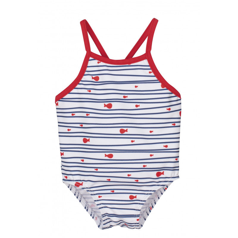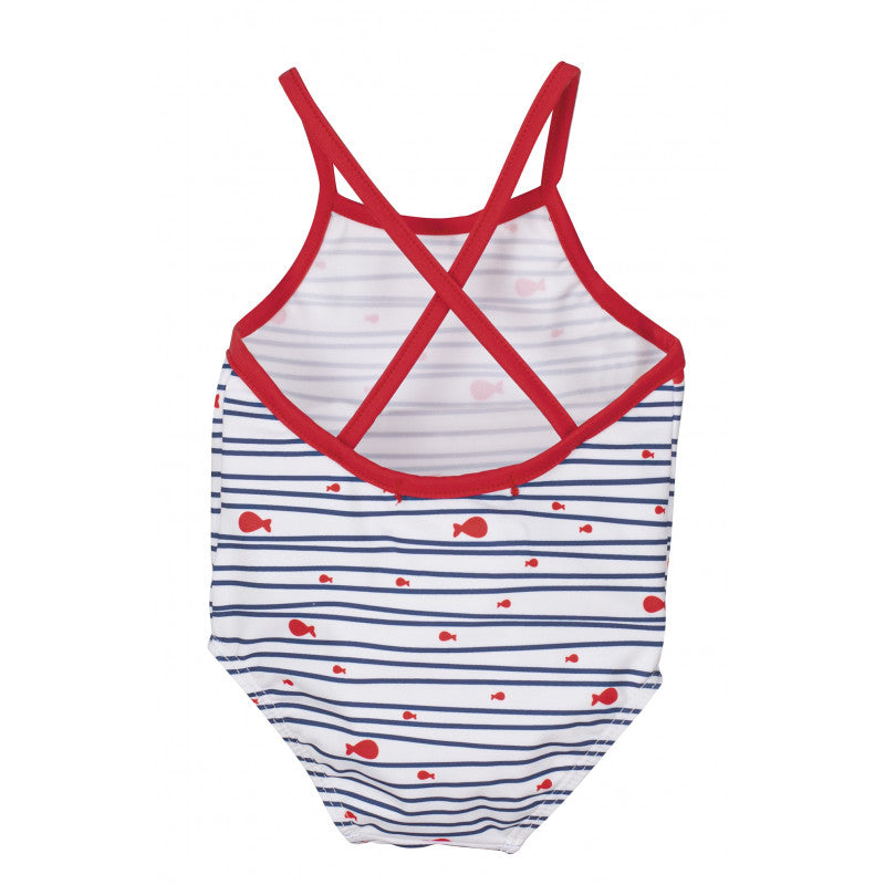 Este bañador para bebé niña combina un diseño encantador con funcionalidad. Presenta un estampado a rayas con dibujos de peces que aportan un toque divertido y veraniego. Su espalda cruzada garantiza un ajuste seguro y cómodo, facilitando el movimiento y la libertad durante el juego en el agua. Ideal para que las más pequeñas luzcan con estilo y a la vez comodidad.