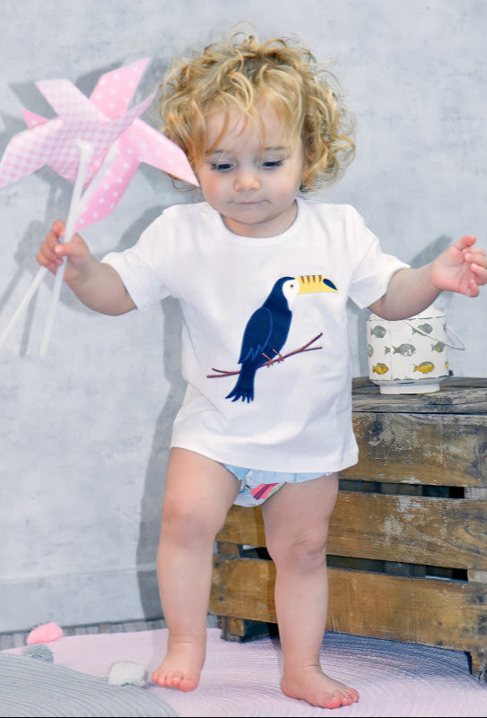 Este conjunto de baño para bebé niña combina comodidad y estilo con una camiseta de algodón de manga corta decorada con un dibujo de tucán y braguitas a juego con volantes delanteros. Ideal para mantener a tu bebé fresca y protegida durante sus momentos de juego en el agua, ofrece un diseño pensado para la delicada piel infantil y un ajuste cómodo que facilita el movimiento. Perfecto para los días de verano, este conjunto une funcionalidad y un toque alegre y colorido.