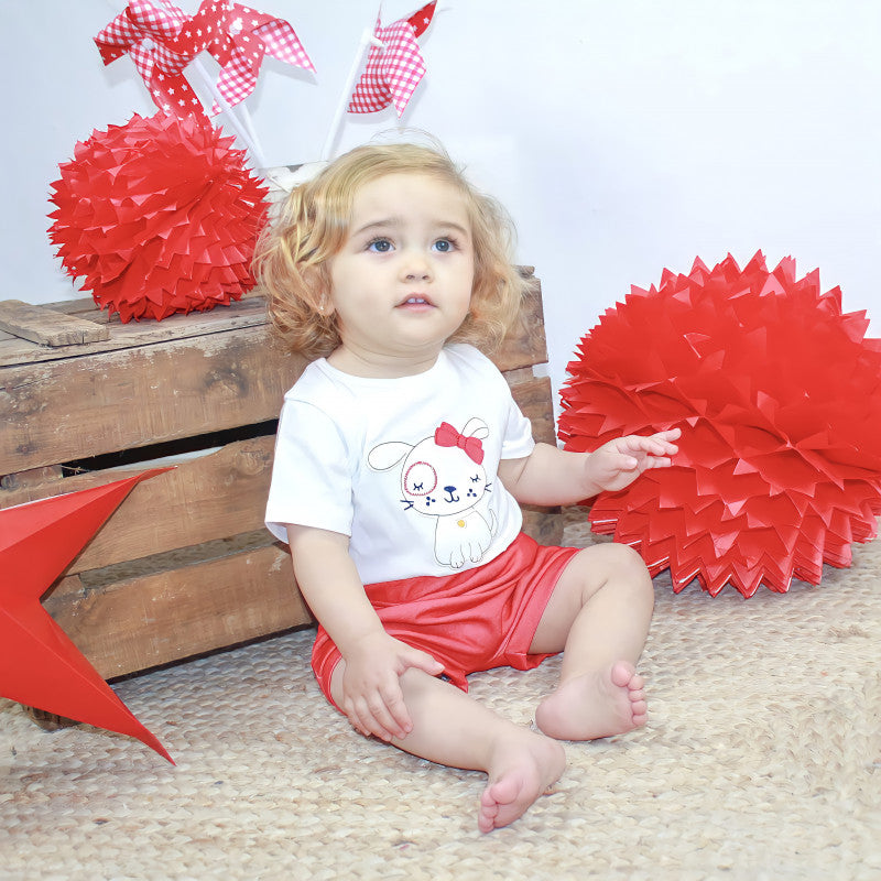 Este conjunto para bebé, confeccionado en algodón suave, incluye una camiseta de manga corta con un delicado dibujo de perrito y un pantalón corto con cintura elástica que garantiza un ajuste cómodo y seguro. Ideal para la piel sensible del bebé, ofrece libertad de movimiento y facilidad para vestir.