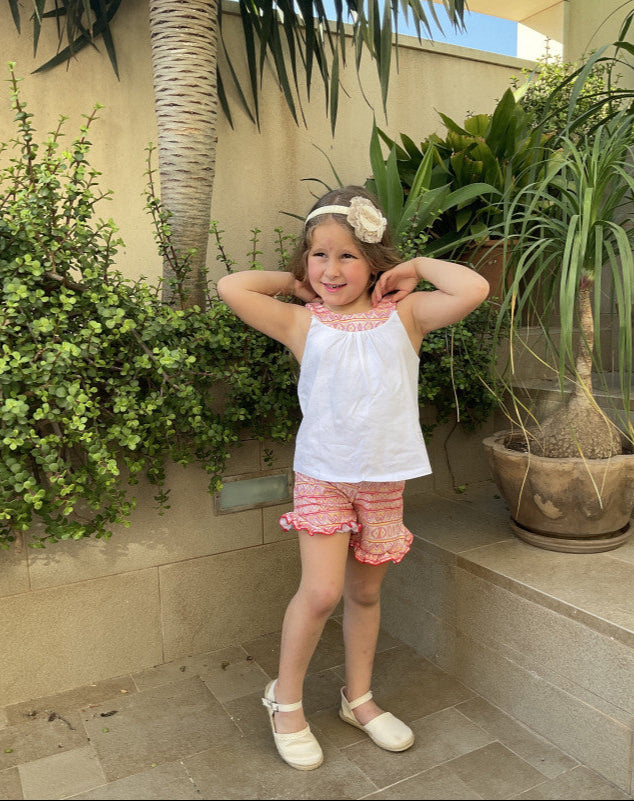 Este conjunto de algodón para niña combina comodidad y estilo con una camiseta de tirantes adornada en el cuello con una banda de estampado étnico y shorts a juego con volantes. Ideal para los días cálidos, ofrece frescura y un diseño cuidado que realza la personalidad de los más pequeños. Perfecto para ocasiones informales donde la comodidad y la moda se unen.