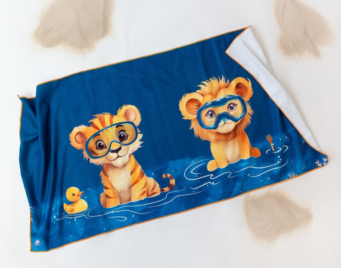 Esta toalla de playa de microfibra, con dimensiones de 150x75 cm, ofrece una rápida absorción y secado eficiente, ideal para días de sol y agua. Su diseño exclusivo con dibujos de tigre y león aporta un toque divertido y original. Incluye una práctica bolsa de rejilla que facilita su transporte y ventilación, manteniendo la toalla fresca y lista para usar. Perfecta para quienes buscan funcionalidad y estilo en sus accesorios de playa.